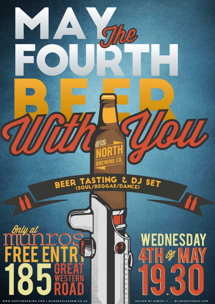 Conception d’une affiche inspirée de la culture pop pour l’événement spécial tap takeover de North Brewing Co à Glasgow, parfaitement programmé pour la Journée Star Wars (4 mai). Ce design accrocheur combine la phrase iconique “Que la Force soit avec toi” avec la culture de la bière, créant “May the Fourth Beer with You” – un jeu de mots mémorable qui célèbre à la fois la franchise sci-fi bien-aimée et l’appréciation de la bière artisanale.